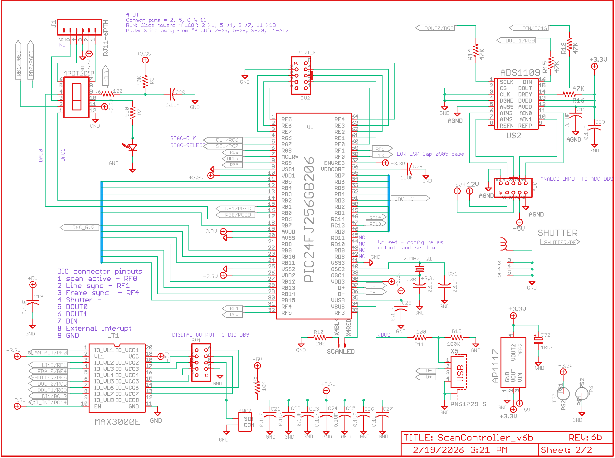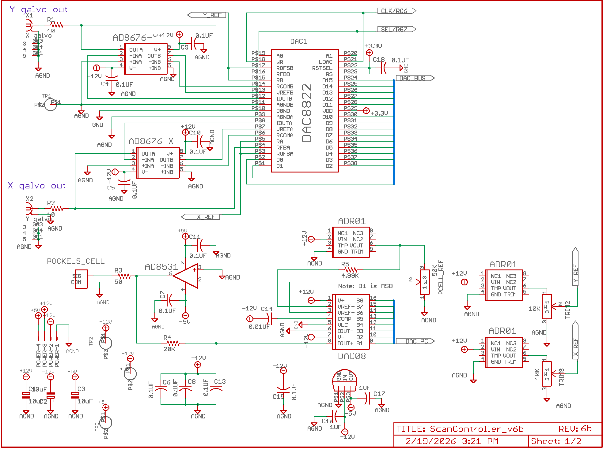 - Two 16-bit DAC outputs buffered by AD8676 opamps sent to X and Y galvo drivers